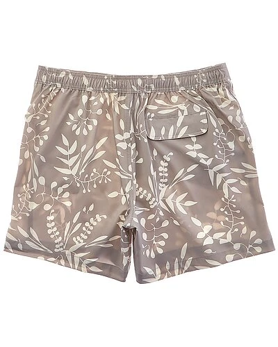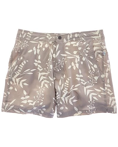 - Calder Swim Trunk in dune chambray tonal leaves with elasticized waist with inner drawstring, two front pockets, back snap pocket and built-in mesh seat