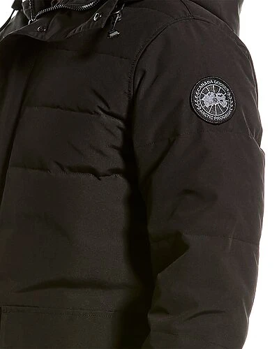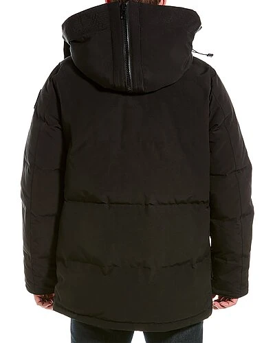 - Wedgemount Black Label Down Parka in black with attached toggle drawstring split hood, stand collar with brushed tricot chin guard, long sleeves, recessed rib-knit cuffs, concealed two-way zip front with snap storm flap
