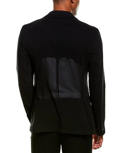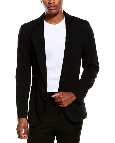 - Blazer in black with layered notch lapel, left chest pocket, two front pockets, button cuffs, and side vents at hem