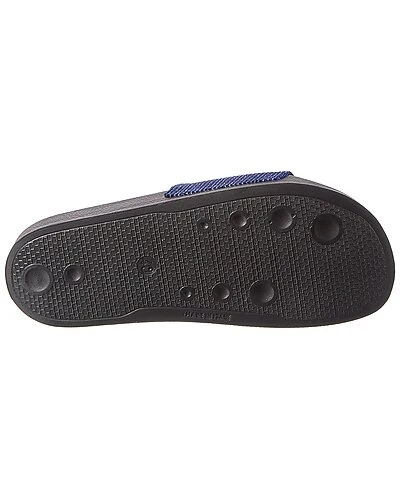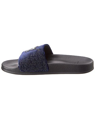 - Newburel Velvet Slide in blue velvet and silver-tone hardware with metallic design and logo accent