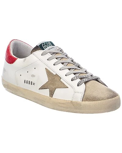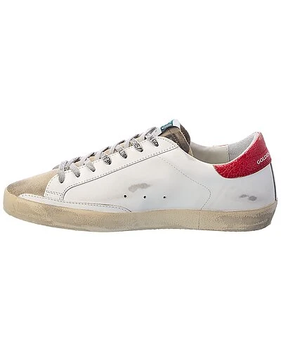 - Superstar Leather Sneaker in white and red leather and silver-tone hardware with distressed design and logo printed laces