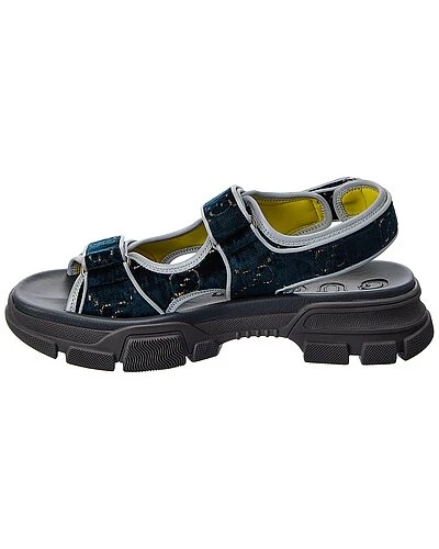 - GG Velvet & Leather Sandal in navy gg velvet and grey leather and dark silver hardware with chunky sole
