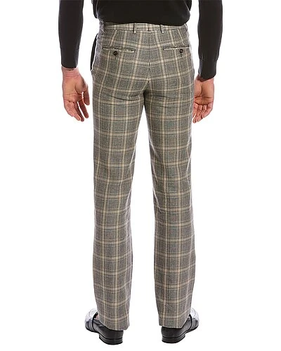 - Prince Of Wales Linen & Wool-Blend Trouser in beige plaid with logo patch at waist, belt loops, dual front welt angled pockets and dual back button-through welt pockets