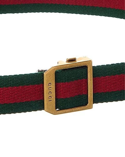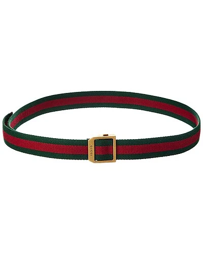 - Web Belt in red and green signature webbing and brown leather with light fine gold hardware