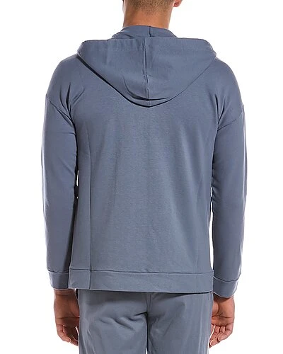 - Zip-Up Hoodie in deep onyx with dual side pockets, drawstrings from hood, and dropped shoulder sleeves