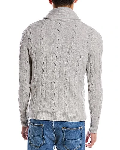 - Shawl Collar Wool Sweater in grey with cable knit detailing and ribbed trim