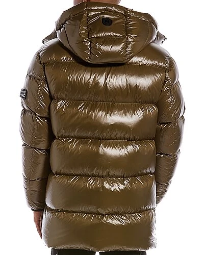 - Kendrick Leather-Trim Down Parka in army with quilted design, drawstring hood, dual chest pockets, dual front flap pockets, ribbed inner cuffs and inner drawcord at hem