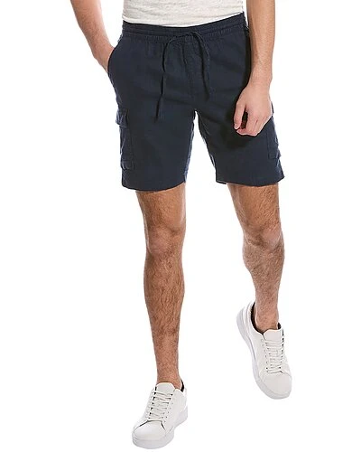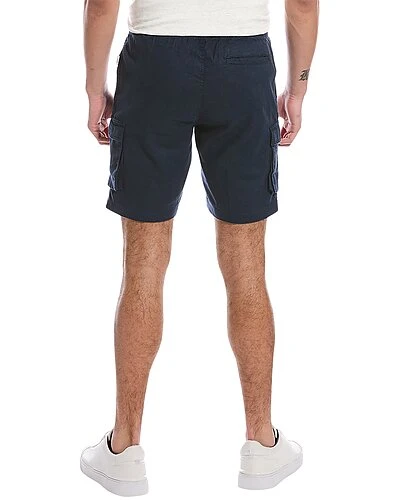 - Pull-On Cargo Short in navy with classic four-pocket styling, additional cargo pockets at pant legs, drawstrings from elasticized waistband