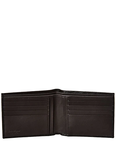 - Gancini Leather Bifold Wallet in black and dark rain leather with gunmetal-tone Gancini detail