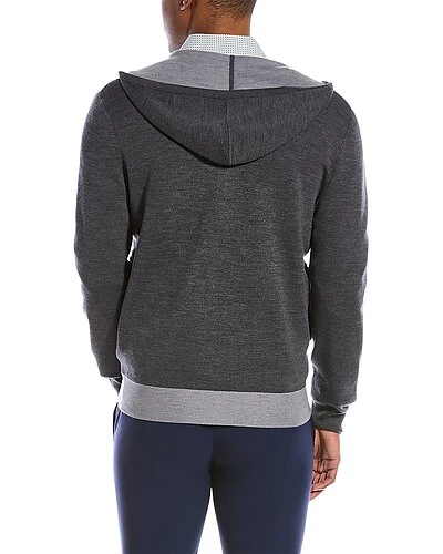 - Arnaud Wool-Blend Hoodie in dark heather grey/cool heather grey with drawstring hood, dual side seam pockets and ribbed trim