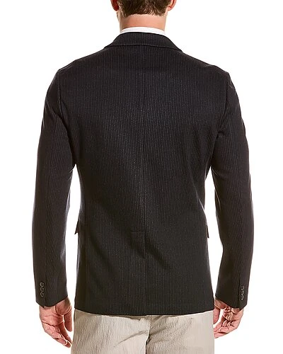 - Clinton Stripe Ponte Blazer in eclipse stripe with notched lapel, two front flap pockets, button accents at cuffs, center vent at back hem and two interior pockets