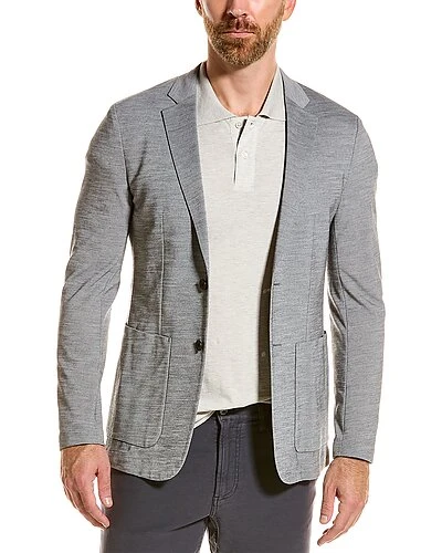 - Clinton Utila Wool-Blend Blazer in light grey heather with notched lapel, two front patch pockets, side vents at back hem and interior pocket