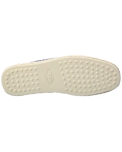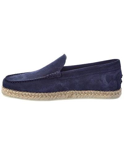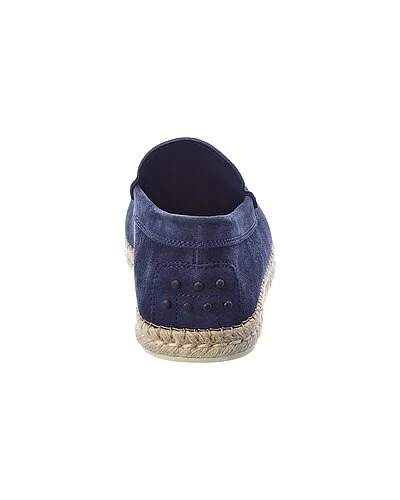 - Suede Espadrille in navy suede with embossed logo and jute trim