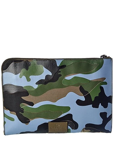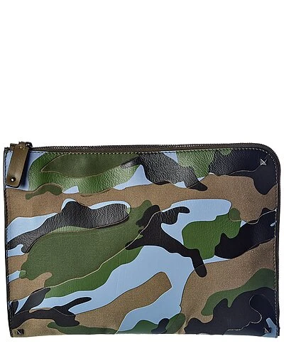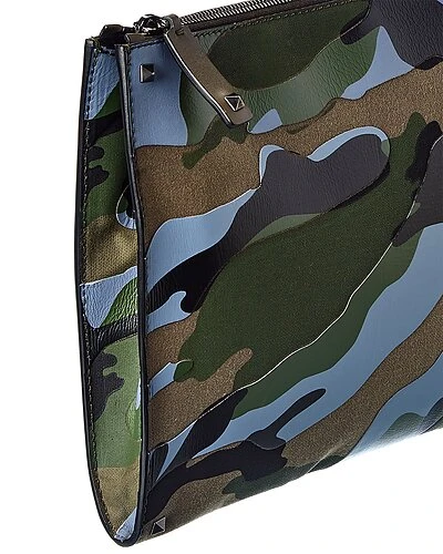 - Canvas & Leather Document Case in green and blue camo canvas and leather and dark silver-tone hardware with rockstud accents