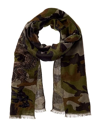 - Cashmere & Silk-Blend Scarf in army camo with embroidered design and fringe trim