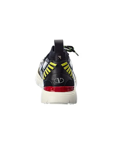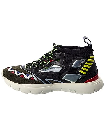 - Mesh & Suede Sneaker in ruby, black and green suede, leather and knit mesh and silver-tone hardware with patterned laces and pull-on tab with rockstud