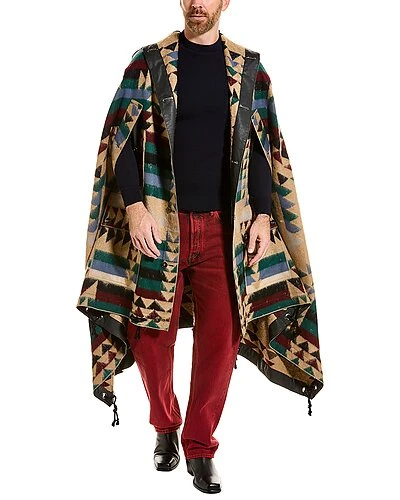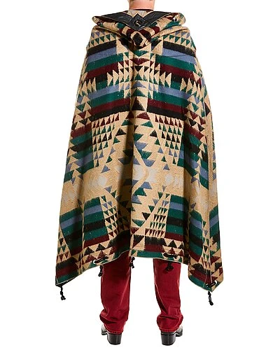 - Pendleton Wool & Mohair-Blend Cape Coat in brown multicolor with hooded back, two front pockets, and rope tie tassels at hem