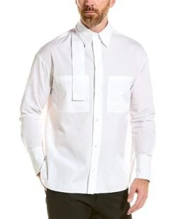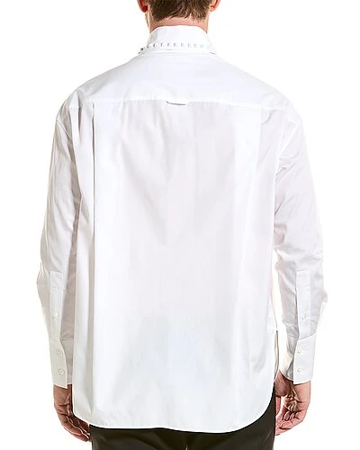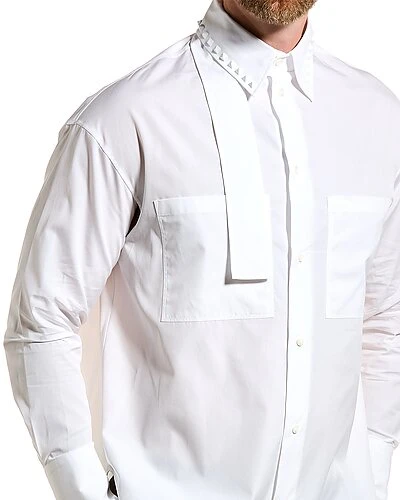 - Rockstud Dress Shirt in white with spread collar, rockstud trim, barrel cuffs, dual chest pockets, and pleats at back