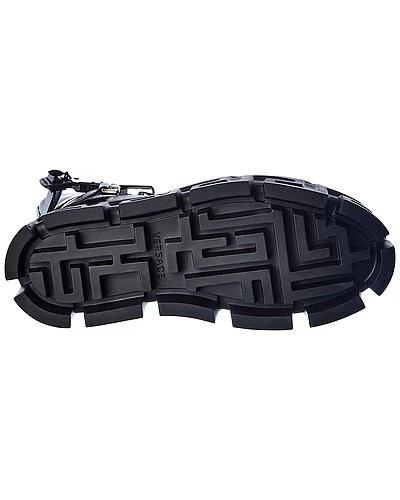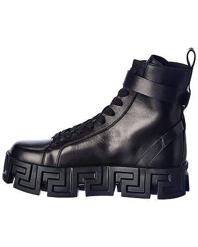 - Greca Labyrinth Leather Boot in black leather and silver-tone hardware with buckle and clip straps and chunky sole