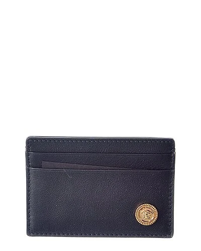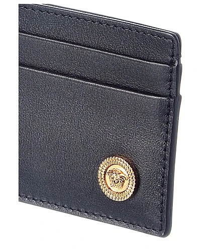 - Medusa Leather Card Case in black leather and gold-tone hardware with logo accent and card slots