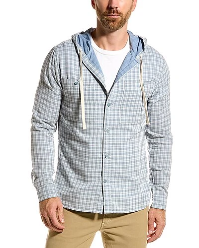 - Desert Side Plaid Hooded Shirt in ice blue with dual chest pockets, barrel cuffs, pleats at back, and shirttail hem