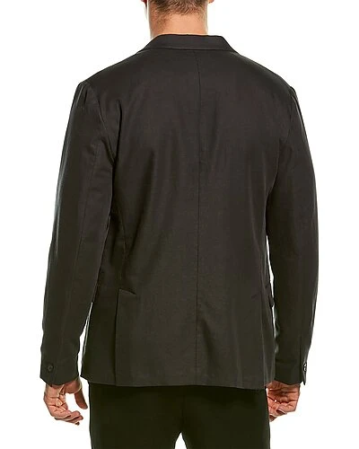 - Linen-Blend Blazer in black with peak lapel, dual front pockets, and button cuffs